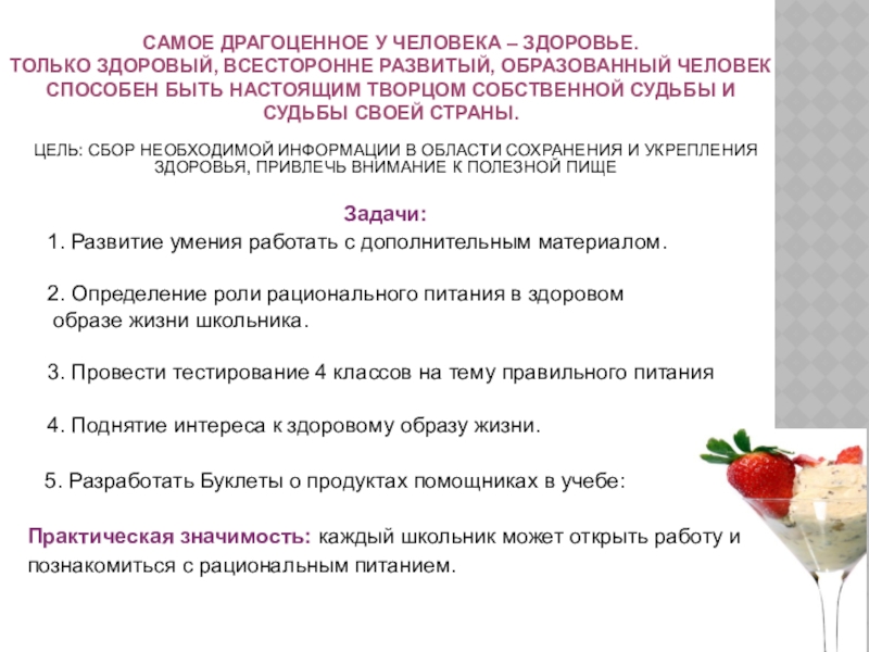Цель: Сбор необходимой информации в области сохранения и укрепления здоровья, привлечь внимание к полезной пище