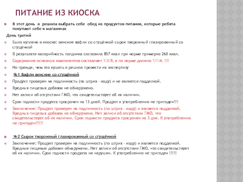 Заключение: Продукт проверен на подлинность (по штрих – коду) и является подделкой. Вредных пищевых добавок не обнаружено. Нет записи об отсутствии ГМО, что свидетельствует об их наличии. Срок годности продукта просрочен на 3 дня. К употреблению не пригоден!!!!!