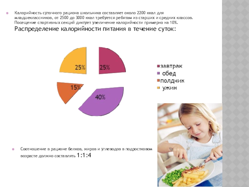 Слайд 12Калорийность суточного рациона школьника составляет около 2200 ккал для младшеклассников, от