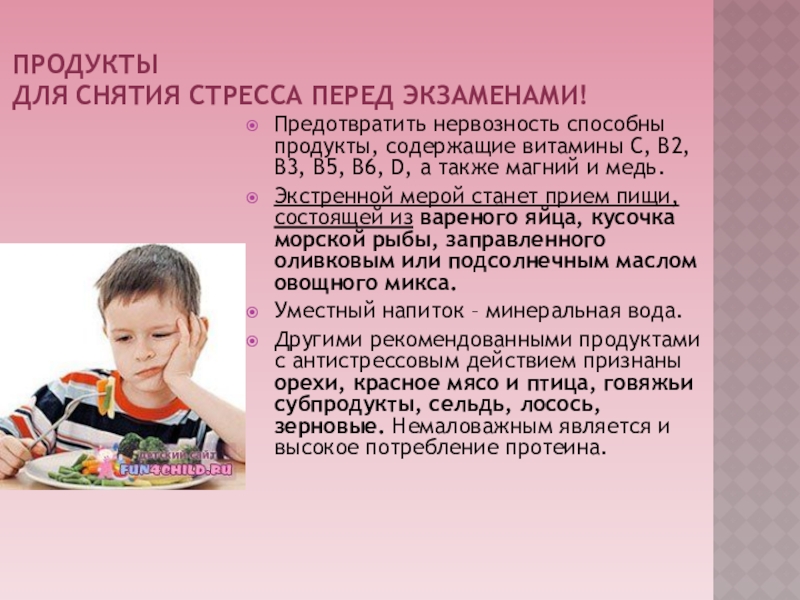 Другими рекомендованными продуктами с антистрессовым действием признаны орехи, красное мясо и птица, говяжьи субпродукты, сельдь, лосось, зерновые. Немаловажным является и высокое потребление протеина.