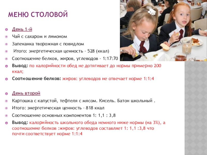 Вывод: калорийность школьного обеда немного ниже нормы (на 3%), а соотношение белков :жиров: углеводов составляет 1: 1,1 :3,8 что почти соответствует норме 1:1:4