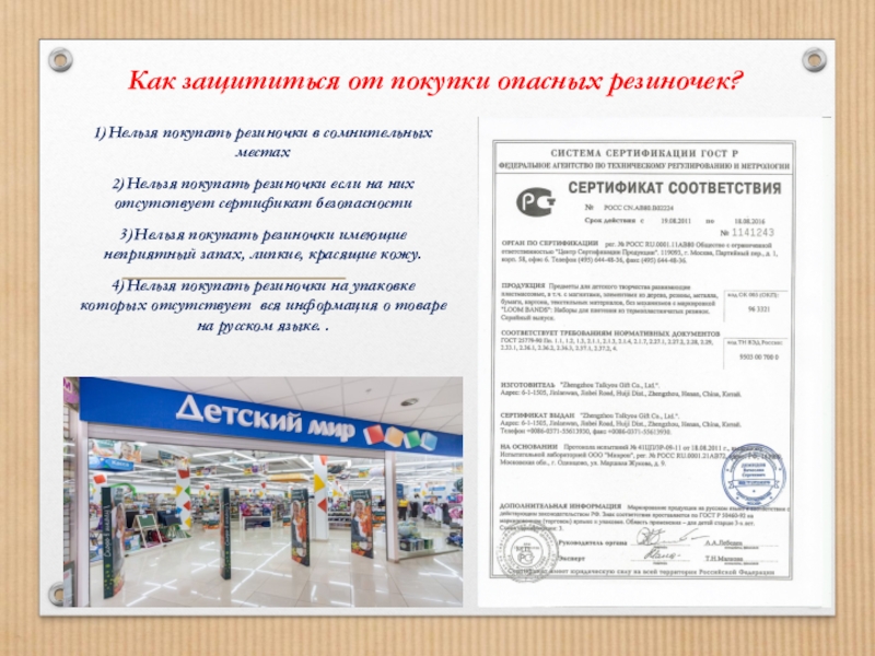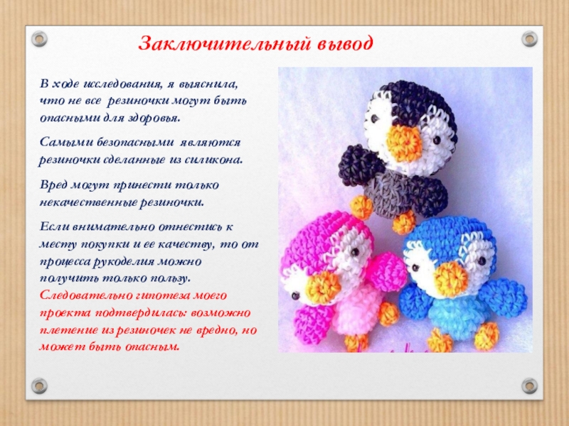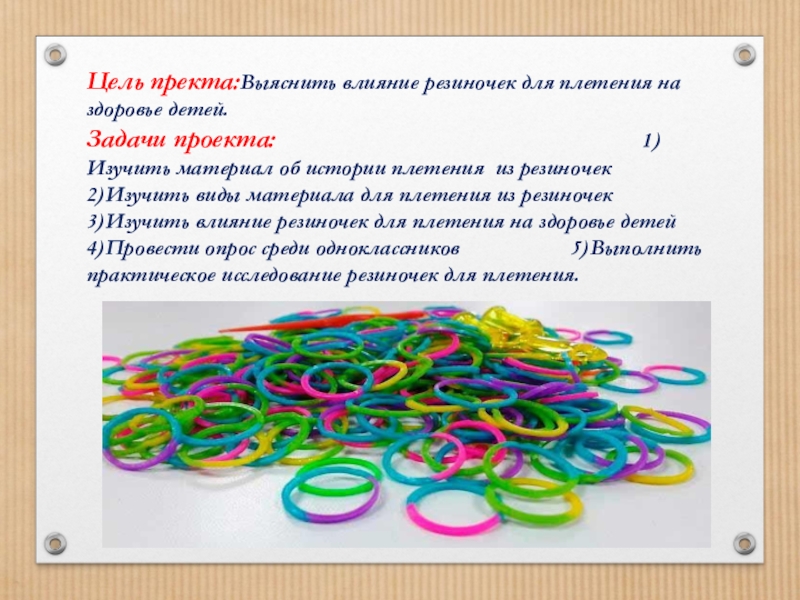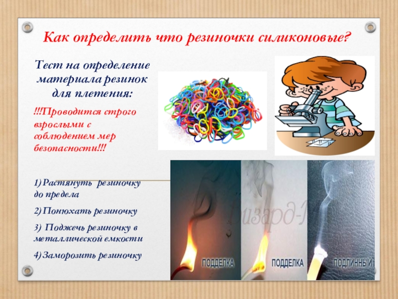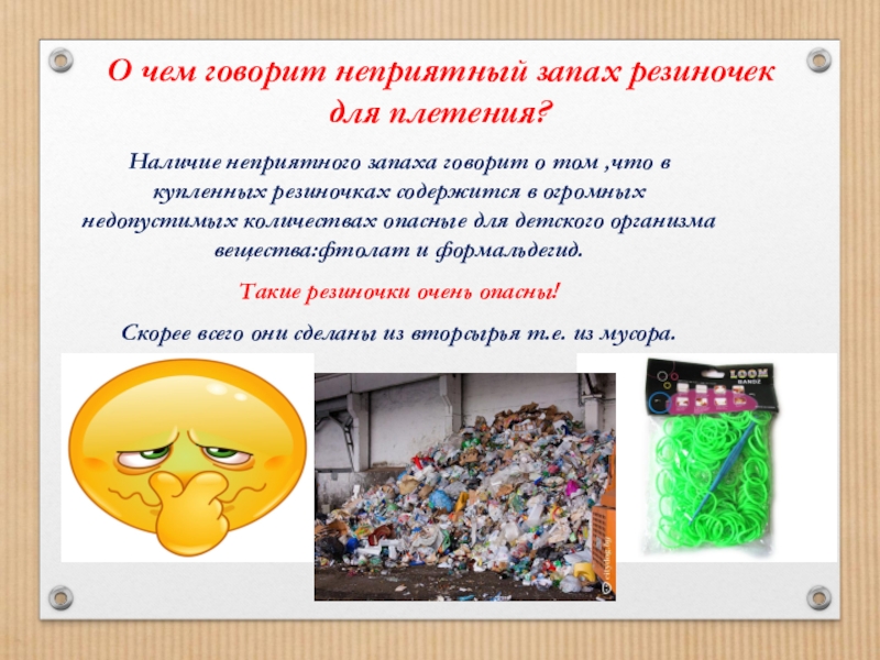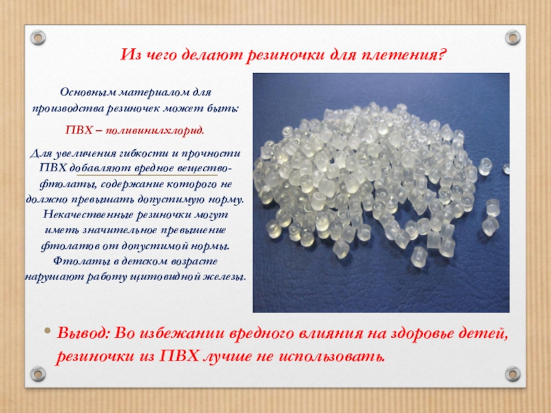 Для увеличения гибкости и прочности ПВХ добавляют вредное вещество-фтолаты, содержание которого не должно превышать допустимую норму. Некачественные резиночки могут иметь значительное превышение фтолатов от допустимой нормы. Фтолаты в детском возрасте нарушают работу щитовидной железы.