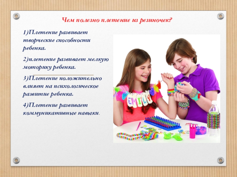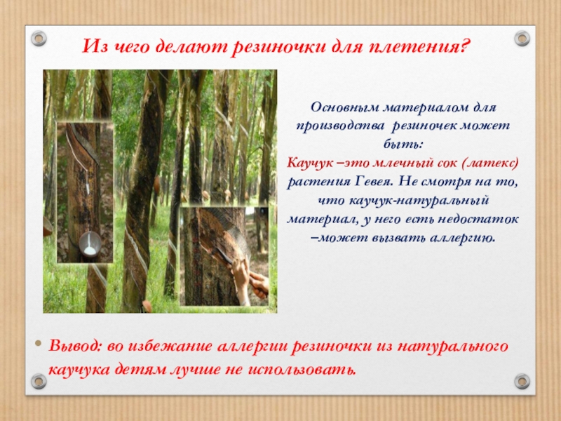 Основным материалом для производства резиночек может быть: Каучук –это млечный сок (латекс) растения Гевея. Не смотря на то,что каучук-натуральный материал, у него есть недостаток –может вызвать аллергию.