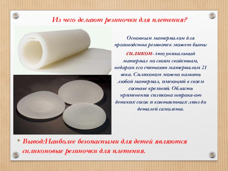 Основным материалом для производства резиночек может быть: силикон- это уникальный материал по своим свойствам, недаром его считают материалом 21 века. Силиконом можно назвать любой материал, имеющий в своем составе кремний. Область применения силикона широка-от детских сосок и контактных линз до деталей самолета.