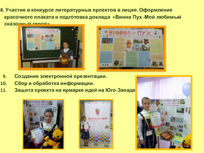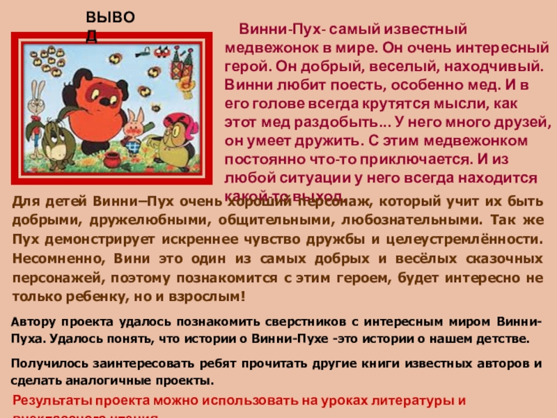 Автору проекта удалось познакомить сверстников с интересным миром Винни-Пуха. Удалось понять, что истории о Винни-Пухе -это истории о нашем детстве.