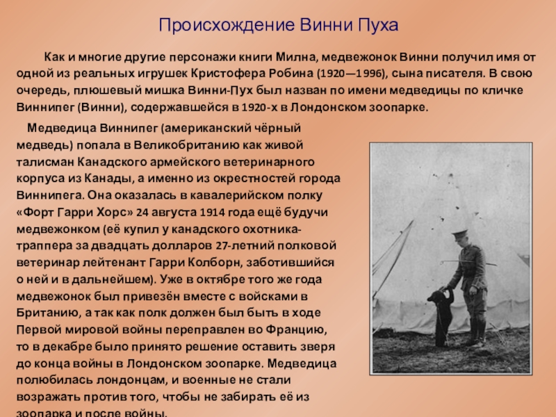 Медведица Виннипег (американский чёрный медведь) попала в Великобританию как живой талисман Канадского армейского ветеринарного корпуса из Канады, а именно из окрестностей города Виннипега. Она оказалась в кавалерийском полку «Форт Гарри Хорс» 24 августа 1914 года ещё будучи медвежонком (её купил у канадского охотника-траппера за двадцать долларов 27-летний полковой ветеринар лейтенант Гарри Колборн, заботившийся о ней и в дальнейшем). Уже в октябре того же года медвежонок был привезён вместе с войсками в Британию, а так как полк должен был быть в ходе Первой мировой войны переправлен во Францию, то в декабре было принято решение оставить зверя до конца войны в Лондонском зоопарке. Медведица полюбилась лондонцам, и военные не стали возражать против того, чтобы не забирать её из зоопарка и после войны.