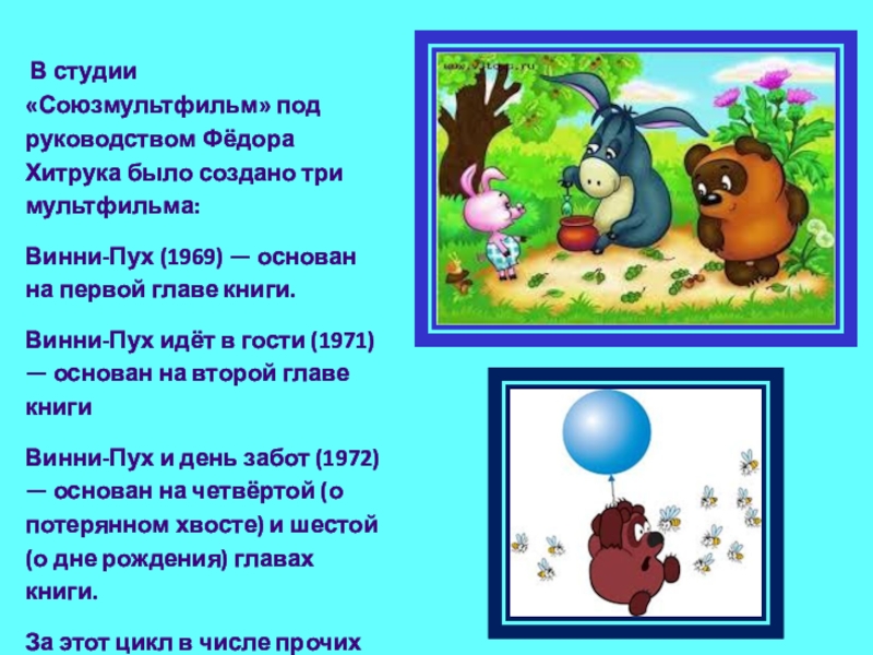 В 1961 году по сюжету некоторых глав первой книги студия Дисней выпустила короткометражные мультфильмы о Винни Пухе.