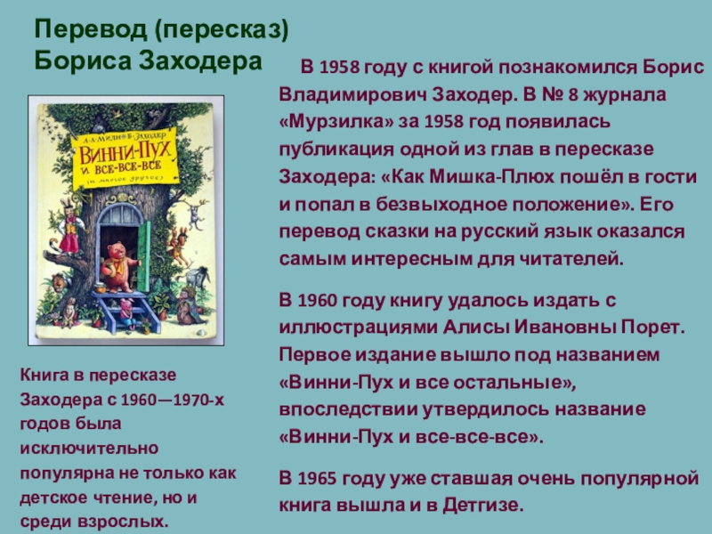 Книга в пересказе Заходера с 1960—1970-х годов была исключительно популярна не только как детское чтение, но и среди взрослых.