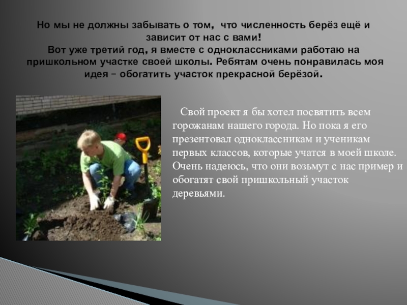 Свой проект я бы хотел посвятить всем горожанам нашего города. Но пока я его презентовал одноклассникам и ученикам первых классов, которые учатся в моей школе. Очень надеюсь, что они возьмут с нас пример и обогатят свой пришкольный участок деревьями.