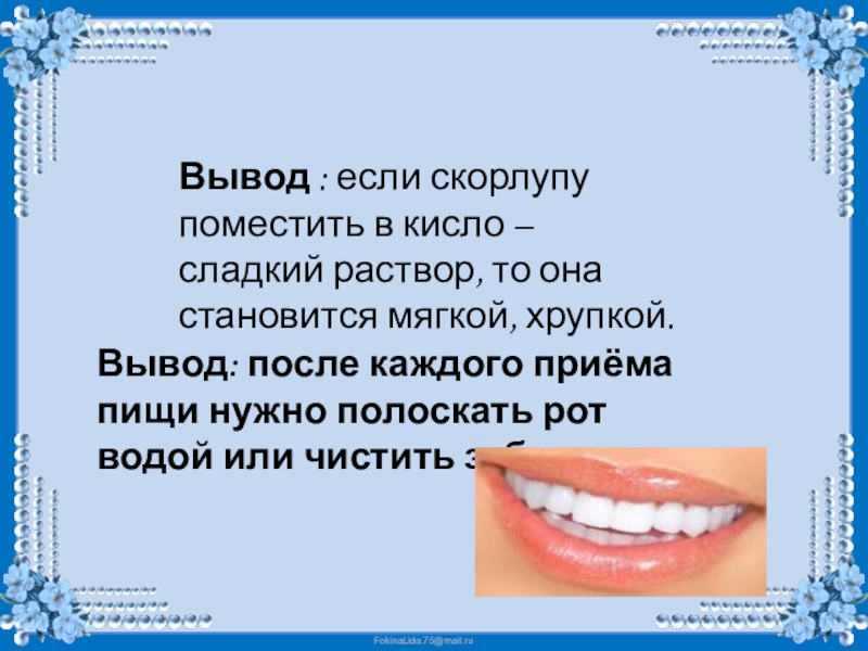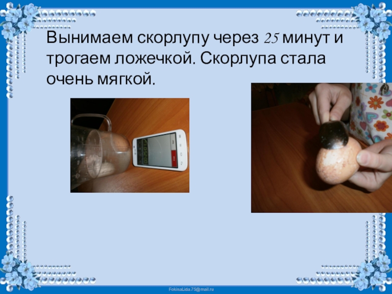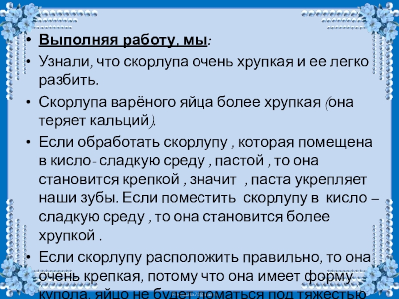 Вывод : если скорлупу поместить в кисло – сладкий раствор, то она становится мягкой, хрупкой.