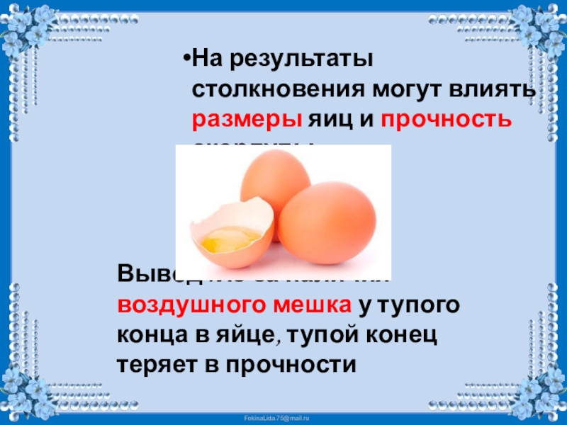 На результаты столкновения могут влиять размеры яиц и прочность скорлупы.