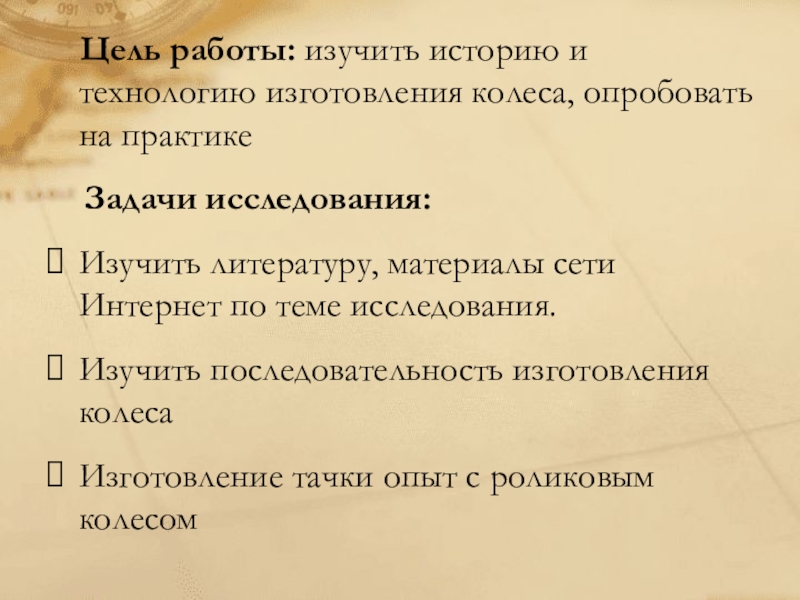 Цель работы: изучить историю и технологию изготовления колеса, опробовать на практике  Задачи исследования:Изучить литературу,