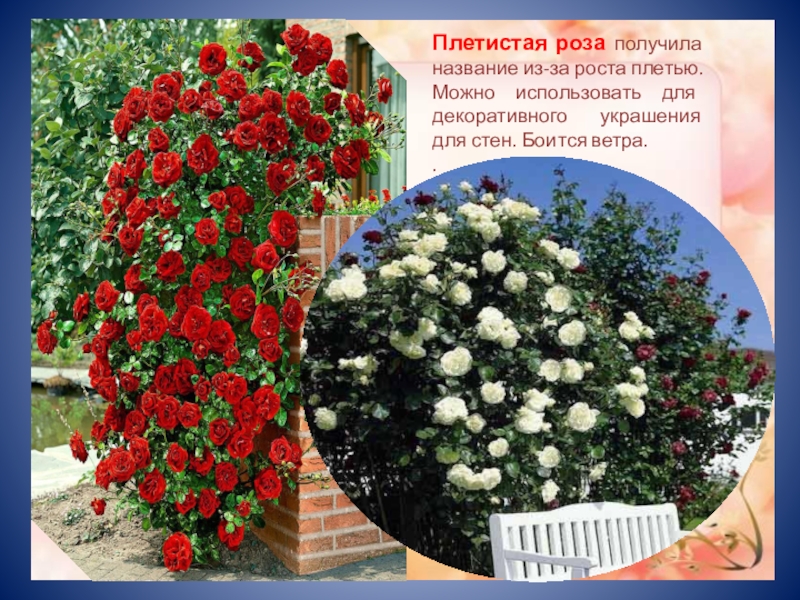 Слайд 12Плетистая роза получила название из-за роста плетью. Можно использовать для декоративного