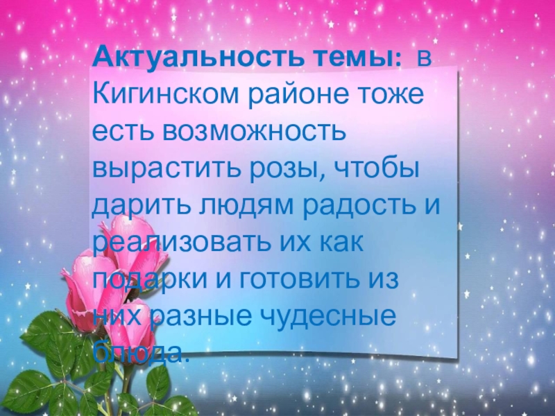 Актуальность темы: в Кигинском районе тоже есть возможность вырастить розы, чтобы