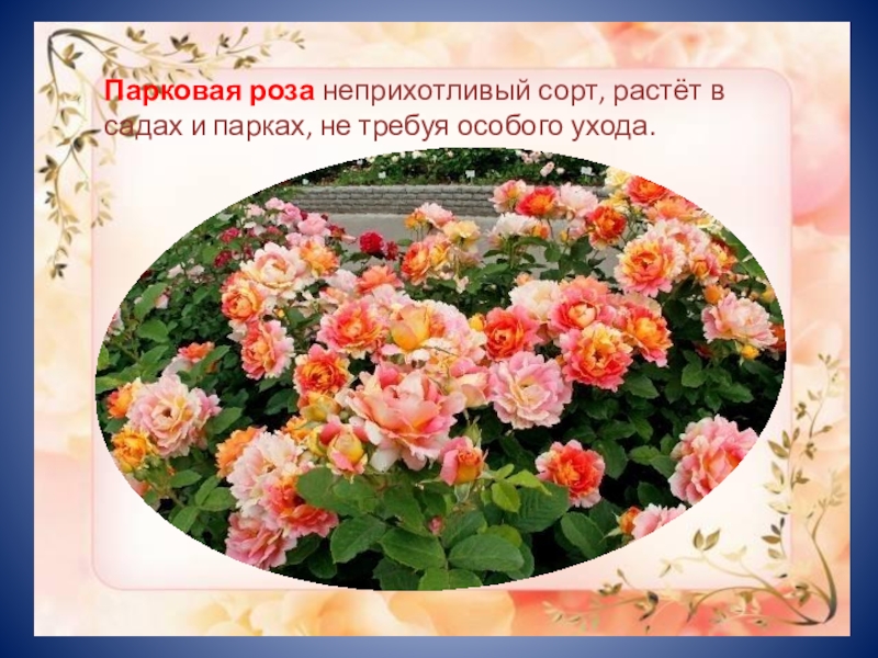 Слайд 14Парковая роза неприхотливый сорт, растёт в садах и парках, не требуя
