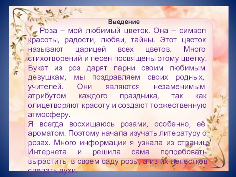 любви, тайны. Этот цветок называют царицей всех цветов. Много стихотворений и песен посвящены этому цветку. Букет из роз дарят парни своим любимым девушкам, мы поздравляем своих родных, учителей. Они являются незаменимым атрибутом каждого праздника, так как олицетворяют красоту и создают торжественную атмосферу.
