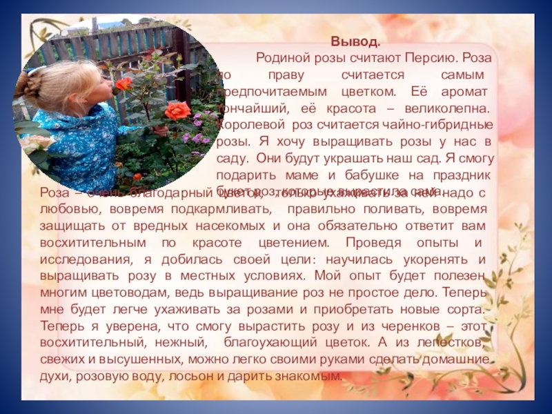 по праву считается самым предпочитаемым цветком. Её аромат тончайший, её красота – великолепна. Королевой роз считается чайно-гибридные розы. Я хочу выращивать розы у нас в саду. Они будут украшать наш сад. Я смогу подарить маме и бабушке на праздник букет роз, которые вырастила сама.
