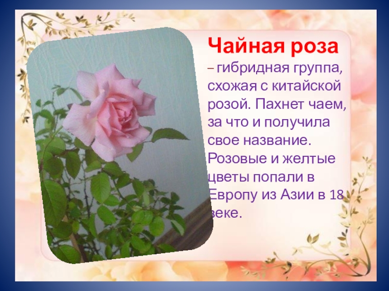 Слайд 10Чайная роза – гибридная группа, схожая с китайской розой. Пахнет чаем,