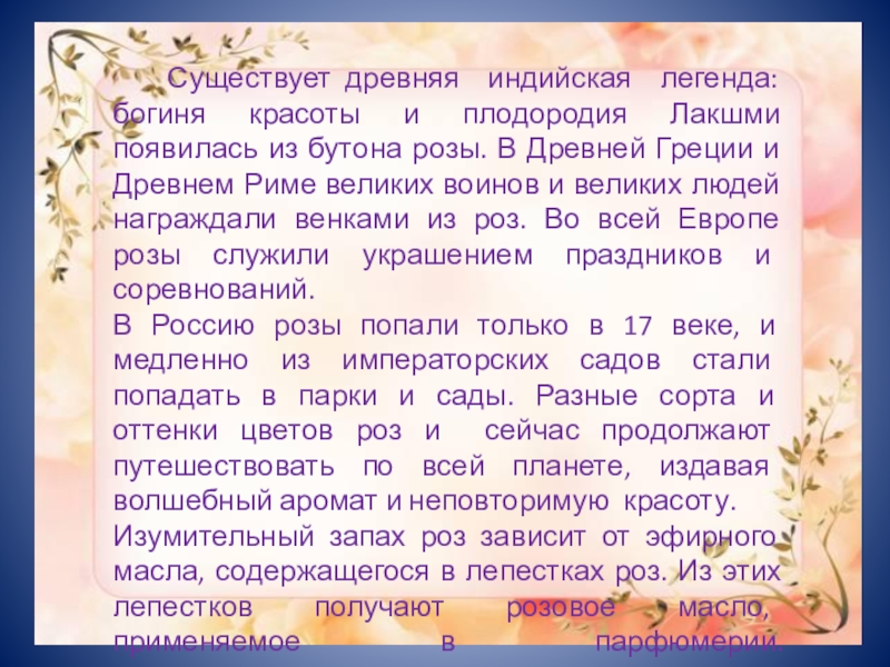 из бутона розы. В Древней Греции и Древнем Риме великих воинов и великих людей награждали венками из роз. Во всей Европе розы служили украшением праздников и соревнований.
