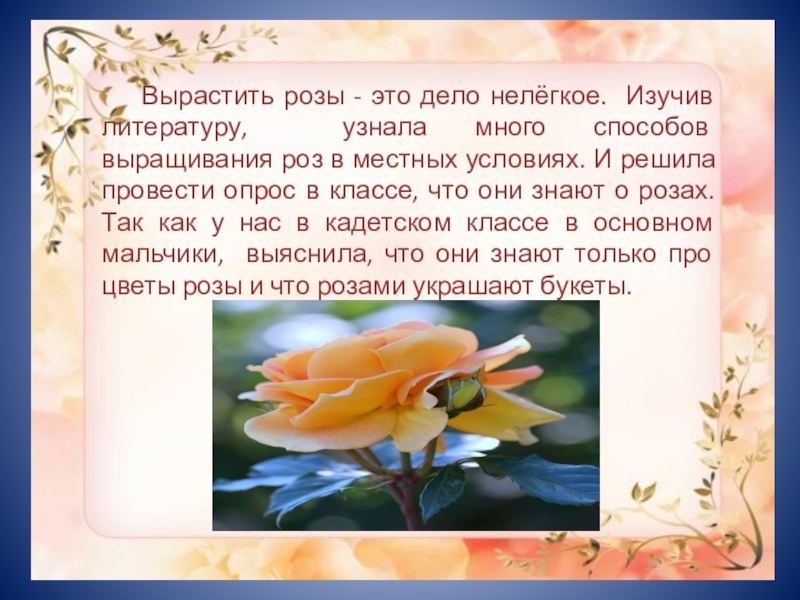 выращивания роз в местных условиях. И решила провести опрос в классе, что они знают о розах. Так как у нас в кадетском классе в основном мальчики, выяснила, что они знают только про цветы розы и что розами украшают букеты.