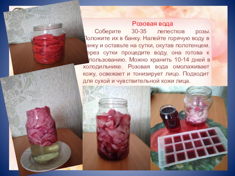 горячую воду в банку и оставьте на сутки, окутав полотенцем. Через сутки процедите воду, она готова к использованию. Можно хранить 10-14 дней в холодильнике. Розовая вода омолаживает кожу, освежает и тонизирует лицо. Подходит для сухой и чувствительной кожи лица.