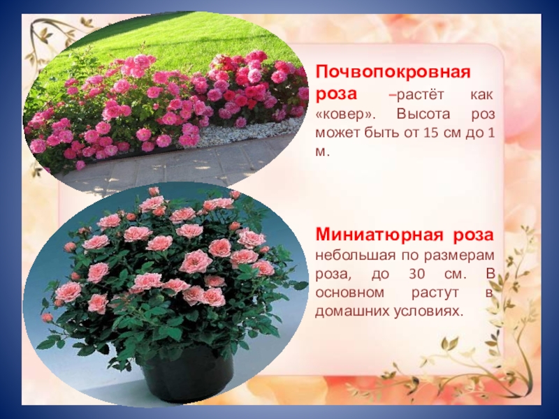 Почвопокровная роза –растёт как «ковер». Высота роз может быть от 15