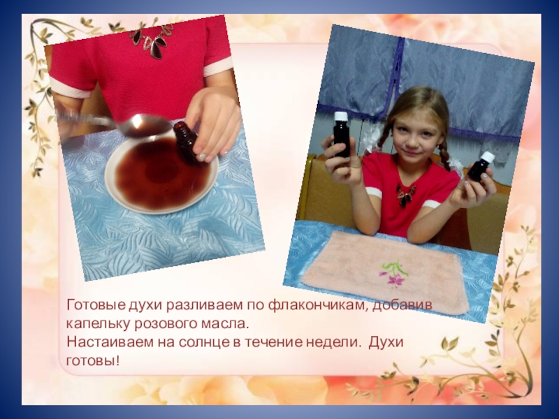 Слайд 29Готовые духи разливаем по флакончикам, добавив капельку розового масла.