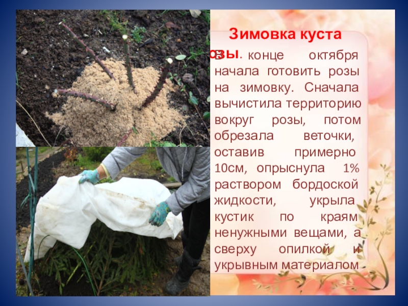 готовить розы на зимовку. Сначала вычистила территорию вокруг розы, потом обрезала веточки, оставив примерно 10см, опрыснула 1% раствором бордоской жидкости, укрыла кустик по краям ненужными вещами, а сверху опилкой и укрывным материалом
