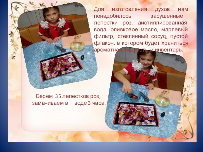 Слайд 23Для изготовления духов нам понадобилось засушенные лепестки роз, дистиллированная вода, оливковое