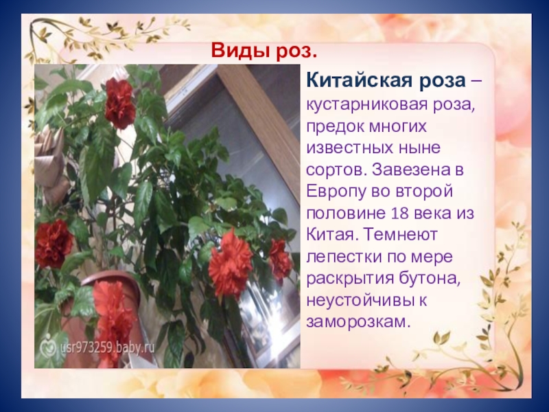 Китайская роза –кустарниковая роза, предок многих известных ныне сортов. Завезена