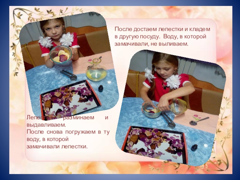 Слайд 24После достаем лепестки и кладем в другую посуду. Воду, в которой