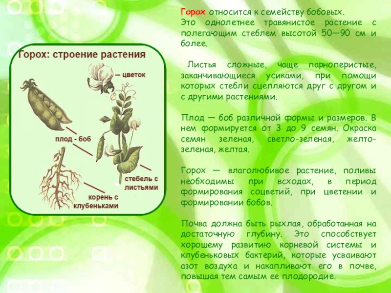 Незаменимых аминокислот в белке гороха почти столько же, сколько в белке мяса; много в нём растительного жира и крахмала, клетчатки и полезных ферментов.