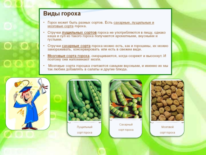 Горох полезен тем, кто ведёт активный образ жизни и занимается физической работой - он помогает организму переносить нагрузки, снабжая его энергией, и повышает работоспособность. Натуральный сахар, содержащийся в некоторых сортах гороха, улучшает память и мозговую деятельность.
