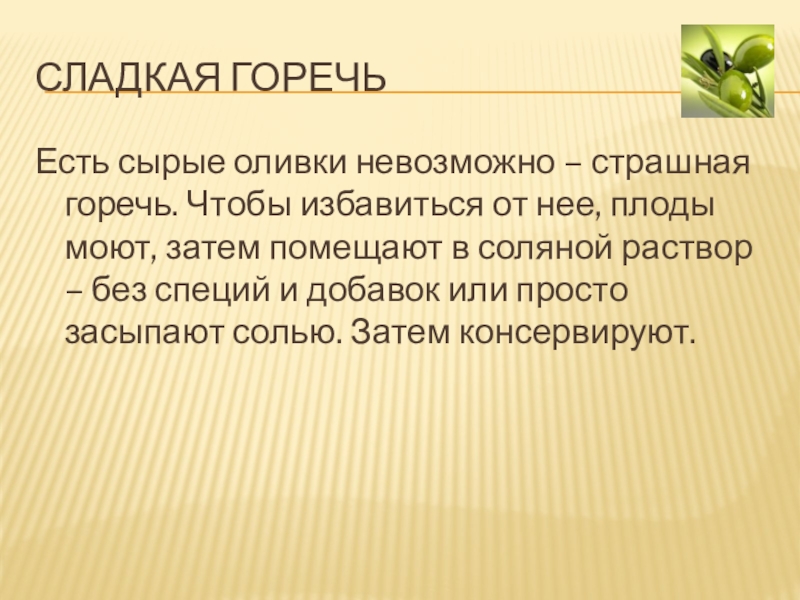 Есть сырые оливки невозможно – страшная горечь. Чтобы избавиться от