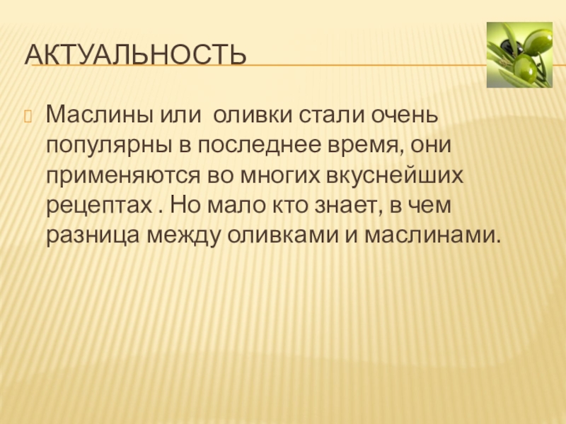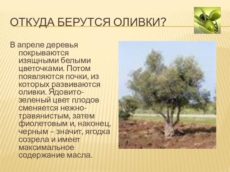 дерева. Во всём мире данные плоды именуют оливками. Второе название - маслины, эти плоды получили в России.
