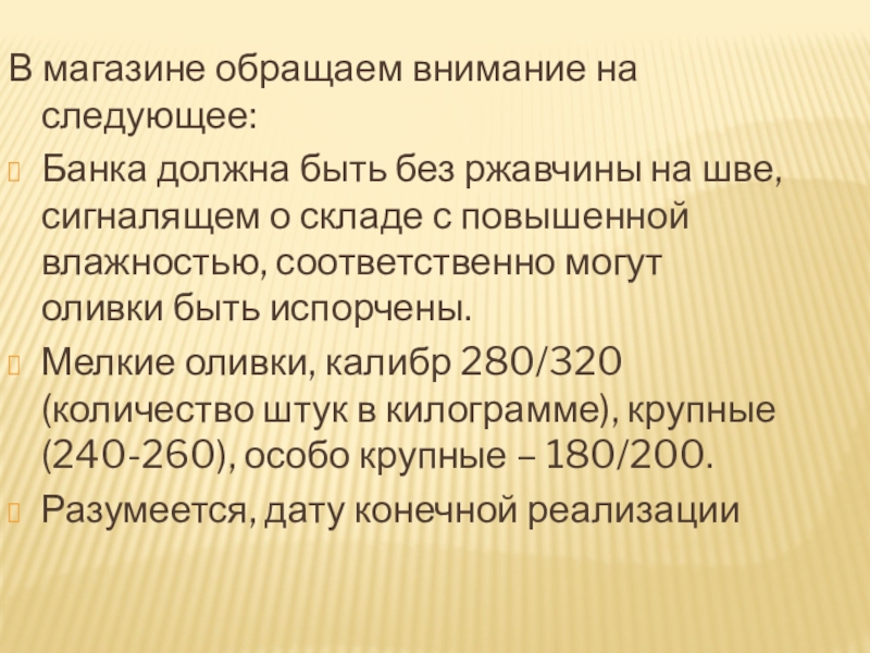 шве, сигналящем о складе с повышенной влажностью, соответственно могут оливки быть испорчены.