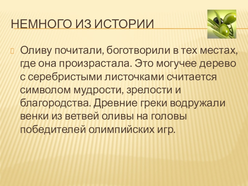 Оливу почитали, боготворили в тех местах, где она произрастала.