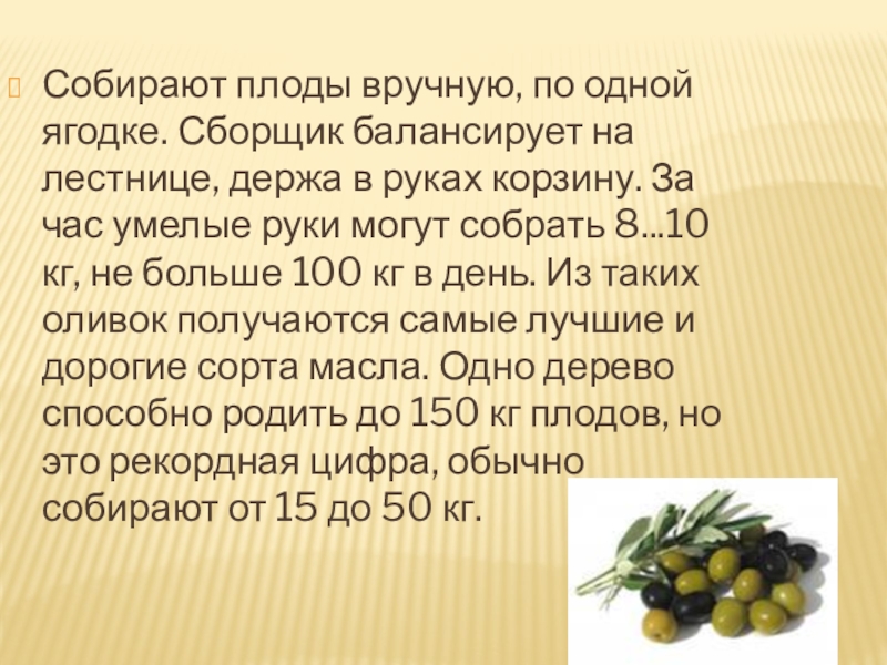 в руках корзину. За час умелые руки могут собрать 8...10 кг, не больше 100 кг в день. Из таких оливок получаются самые лучшие и дорогие сорта масла. Одно дерево способно родить до 150 кг плодов, но это рекордная цифра, обычно собирают от 15 до 50 кг.