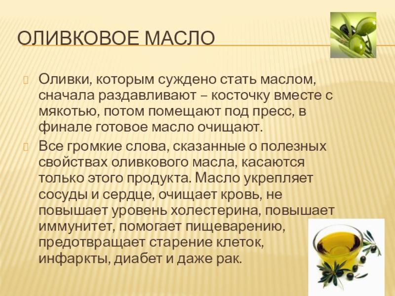 Все громкие слова, сказанные о полезных свойствах оливкового масла, касаются только этого продукта. Масло укрепляет сосуды и сердце, очищает кровь, не повышает уровень холестерина, повышает иммунитет, помогает пищеварению, предотвращает старение клеток, инфаркты, диабет и даже рак.