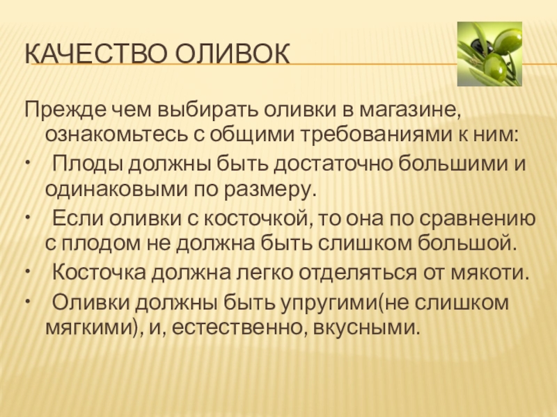 • Оливки должны быть упругими(не слишком мягкими), и, естественно, вкусными.