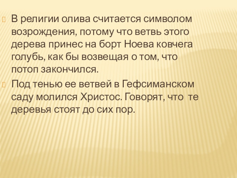 Слайд 9В религии олива считается символом возрождения, потому что ветвь этого дерева