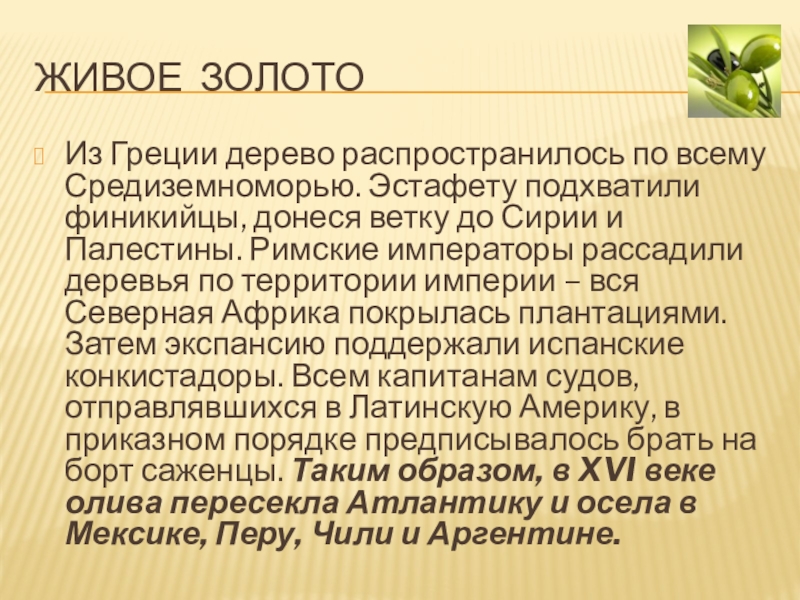 финикийцы, донеся ветку до Сирии и Палестины. Римские императоры рассадили деревья по территории империи – вся Северная Африка покрылась плантациями. Затем экспансию поддержали испанские конкистадоры. Всем капитанам судов, отправлявшихся в Латинскую Америку, в приказном порядке предписывалось брать на борт саженцы. Таким образом, в XVI веке олива пересекла Атлантику и осела в Мексике, Перу, Чили и Аргентине.