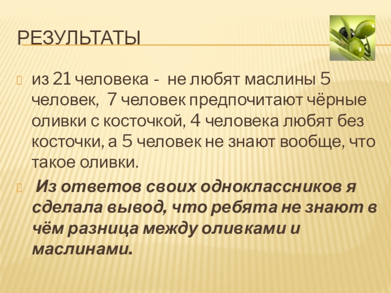 Из ответов своих одноклассников я сделала вывод, что ребята не знают в чём разница между оливками и маслинами.