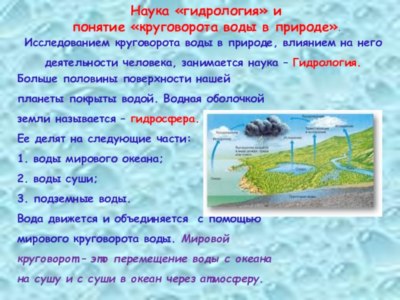 Больше половины поверхности нашей планеты покрыты водой. Водная оболочкой земли называется – гидросфера.