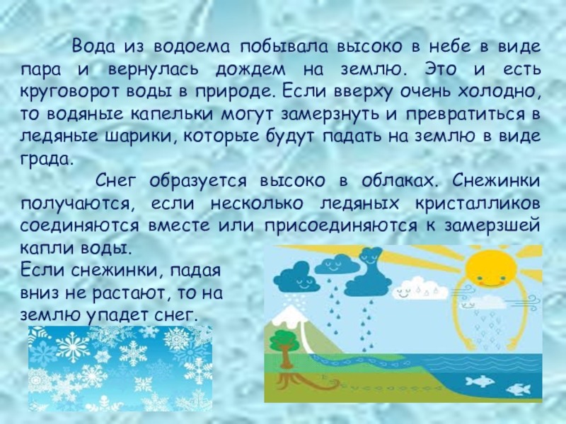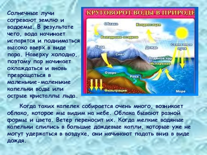 Когда таких капелек собирается очень много, возникает облако, которое мы видим на небе. Облака бывают разной формы и цвета. Ветер переносит их. Когда мелкие водяные капельки слились в большие дождевые капли, которые уже не могут удержаться в воздухе, они начинают падать вниз в виде дождя.