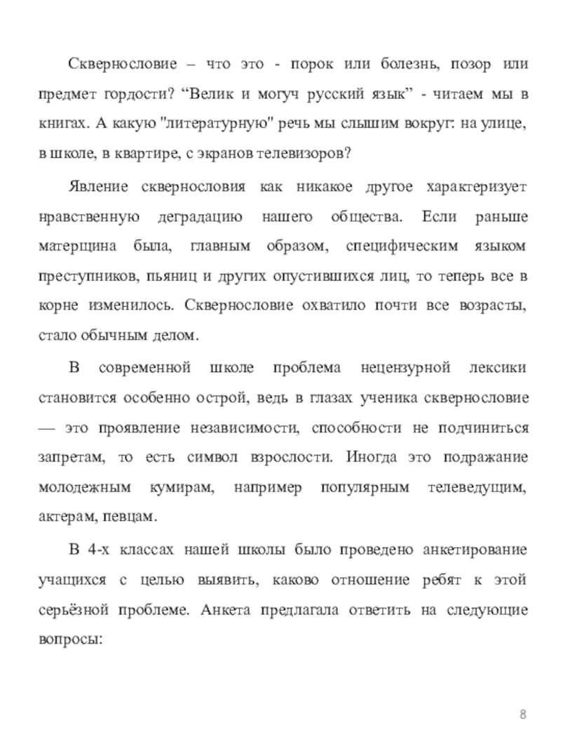 Явление сквернословия как никакое другое характеризует нравственную деградацию нашего общества. Если раньше матерщина была, главным образом, специфическим языком преступников, пьяниц и других опустившихся лиц, то теперь все в корне изменилось. Сквернословие охватило почти все возрасты, стало обычным делом.