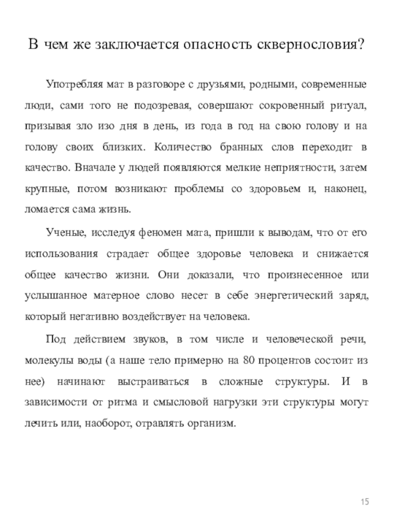 родными, современные люди, сами того не подозревая, совершают сокровенный ритуал, призывая зло изо дня в день, из года в год на свою голову и на голову своих близких. Количество бранных слов переходит в качество. Вначале у людей появляются мелкие неприятности, затем крупные, потом возникают проблемы со здоровьем и, наконец, ломается сама жизнь.