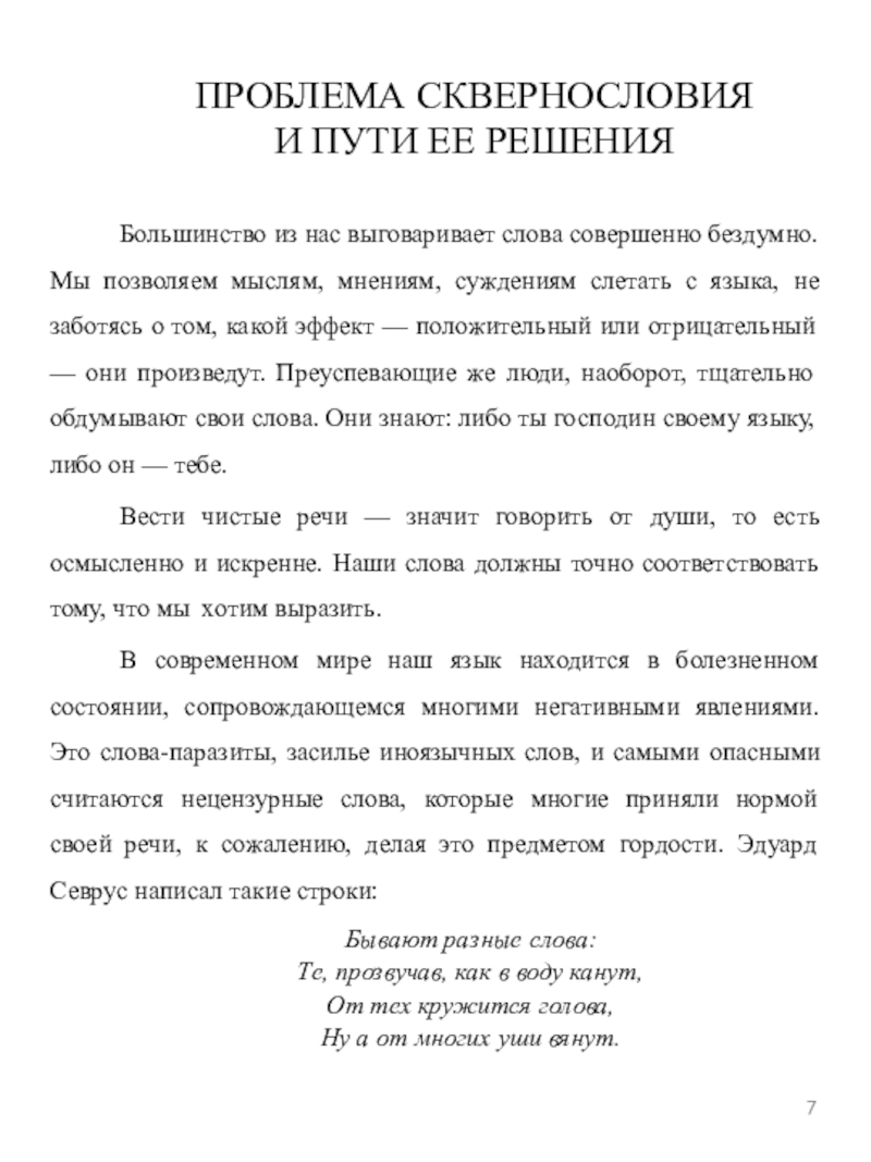В современном мире наш язык находится в болезненном состоянии, сопровождающемся многими негативными явлениями. Это слова-паразиты, засилье иноязычных слов, и самыми опасными считаются нецензурные слова, которые многие приняли нормой своей речи, к сожалению, делая это предметом гордости. Эдуард Севрус написал такие строки: