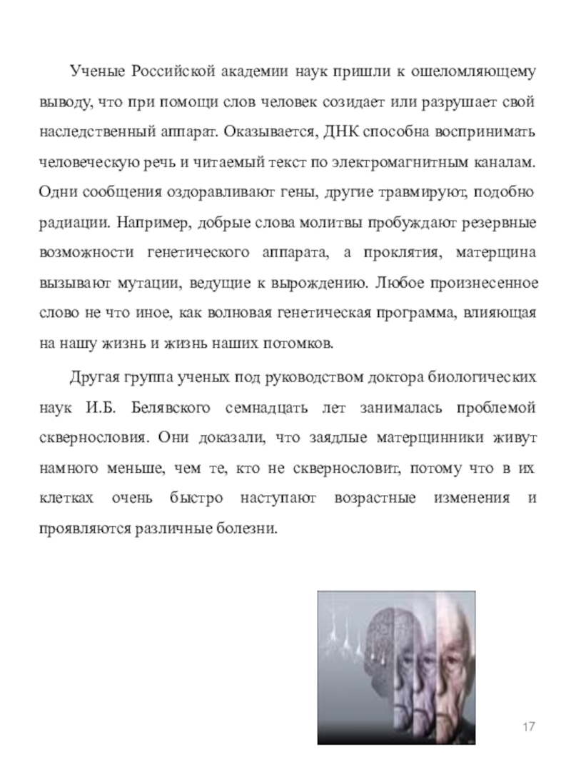 Другая группа ученых под руководством доктора биологических наук И.Б. Белявского семнадцать лет занималась проблемой сквернословия. Они доказали, что заядлые матерщинники живут намного меньше, чем те, кто не сквернословит, потому что в их клетках очень быстро наступают возрастные изменения и проявляются различные болезни.