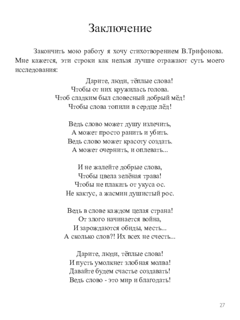 Закончить мою работу я хочу стихотворением В.Трифонова. Мне кажется, эти строки